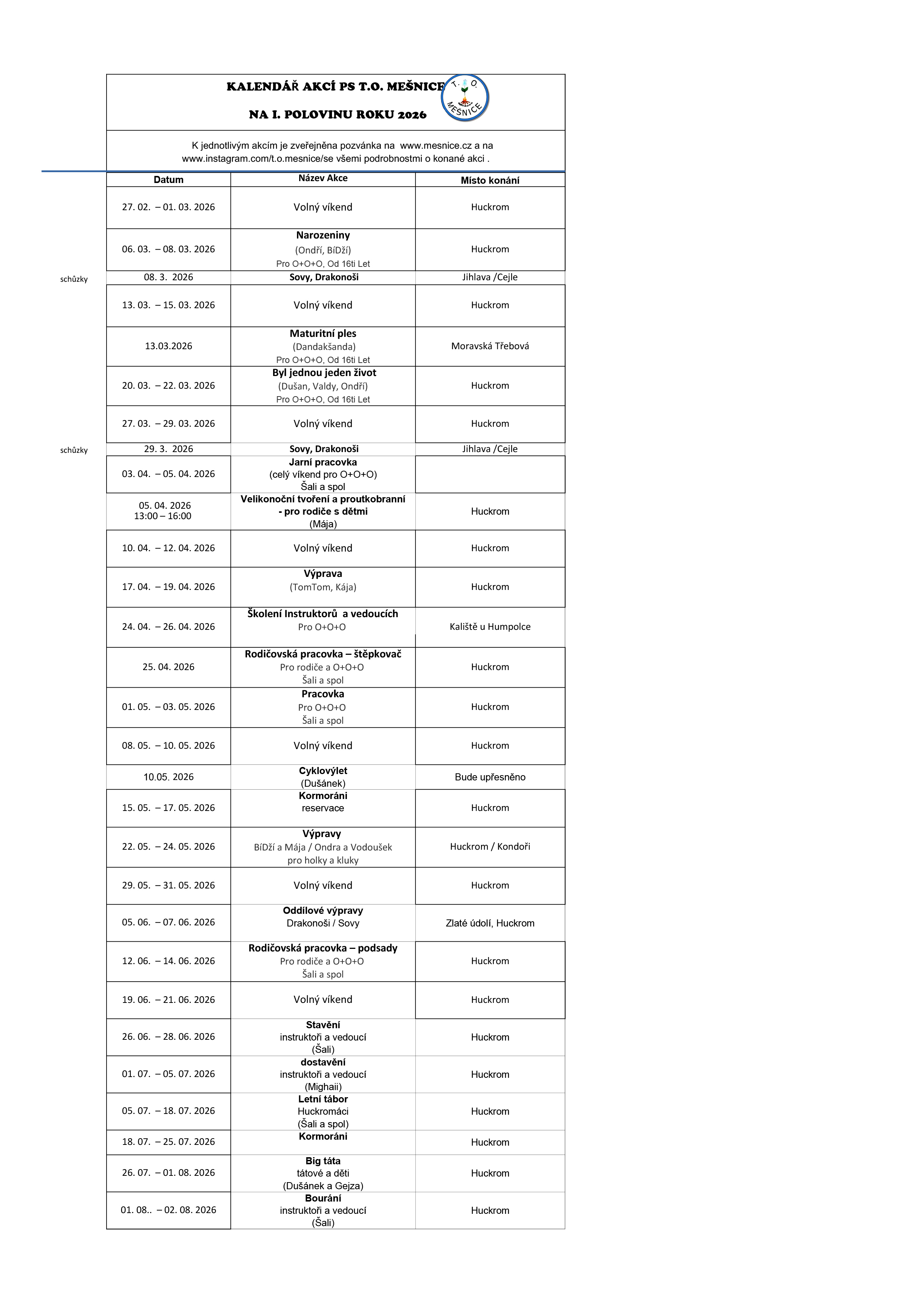 Kalendář akcí PS T.O. Mešnice na I. polovinu roku 2026 v PDF formátu. ![]() Vždy se nahlaste do středy před datem výpravy do 18:00 hod. Možnosti nahlášení: